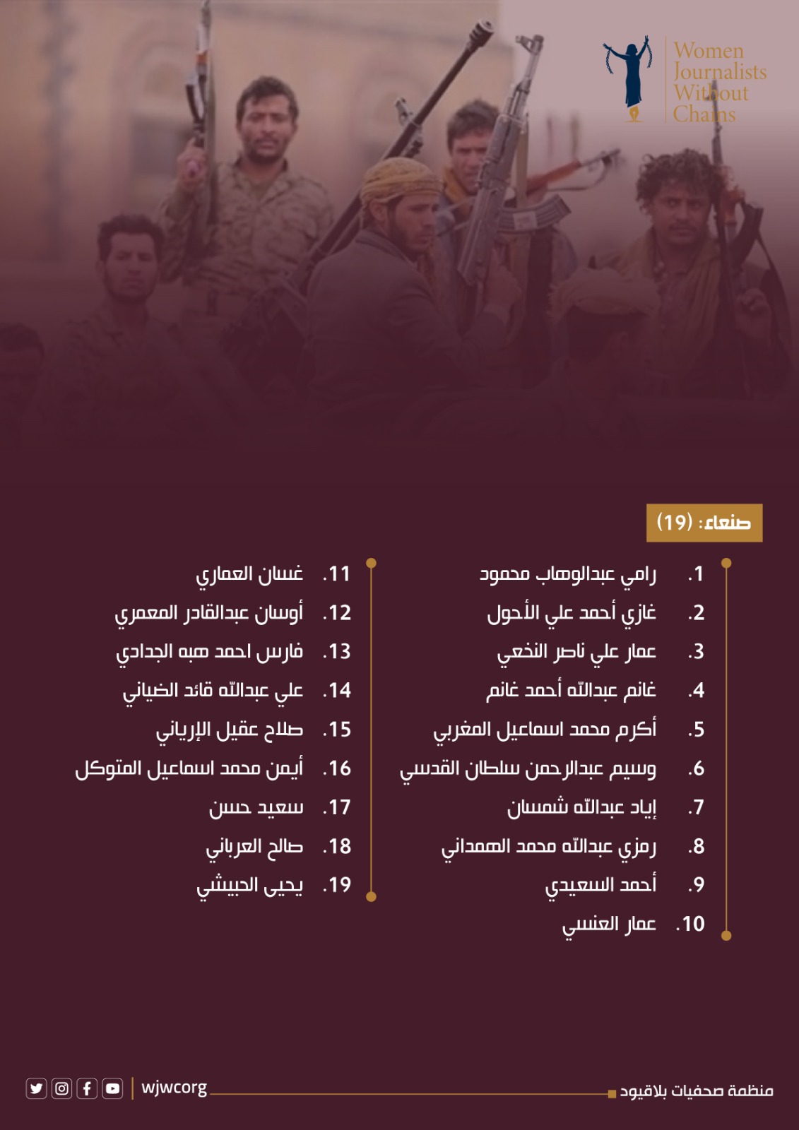 وفي إطار جهودها في الرصد والتوثيق، أكدت منظمة صحفيات بلا قيود أنها وثقت قائمة تضم (186) مختطفاً اختطفتهم مليشيا الحوثي خلال الفترة من مايو وحتى أغسطس 2025 في سبع محافظات على النحو الآتي: إب (110)، تعز (25)، صنعاء (19)، ريمة (12)، الحديدة (9)، البيضاء (8)، وذمار (3).