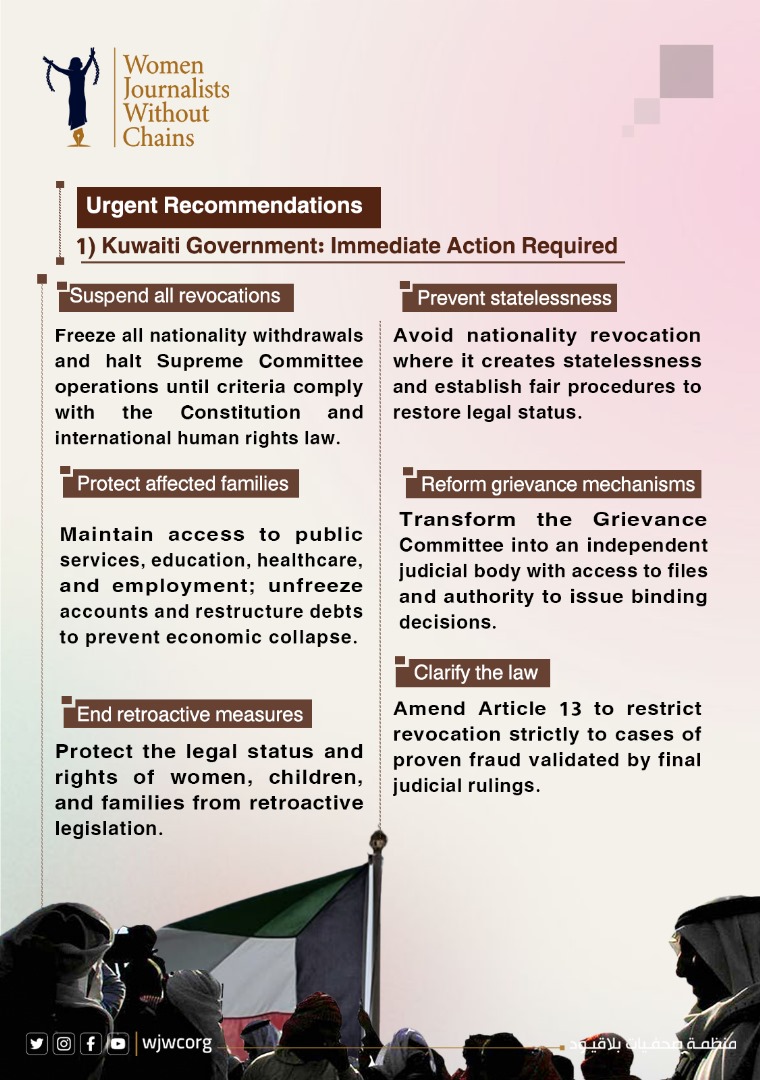 Against this backdrop, Women Journalists Without Chains has warned that what is unfolding constitutes one of the gravest citizenship crises in Kuwait’s modern history. The organization has documented the legal and humanitarian dimensions of the crisis and cautioned that the continuation of these policies threatens the very foundations of citizenship and social stability in the country.